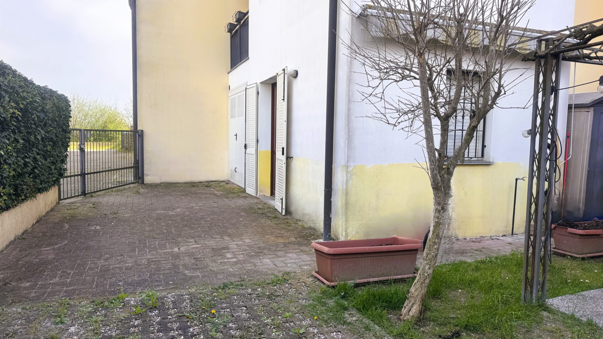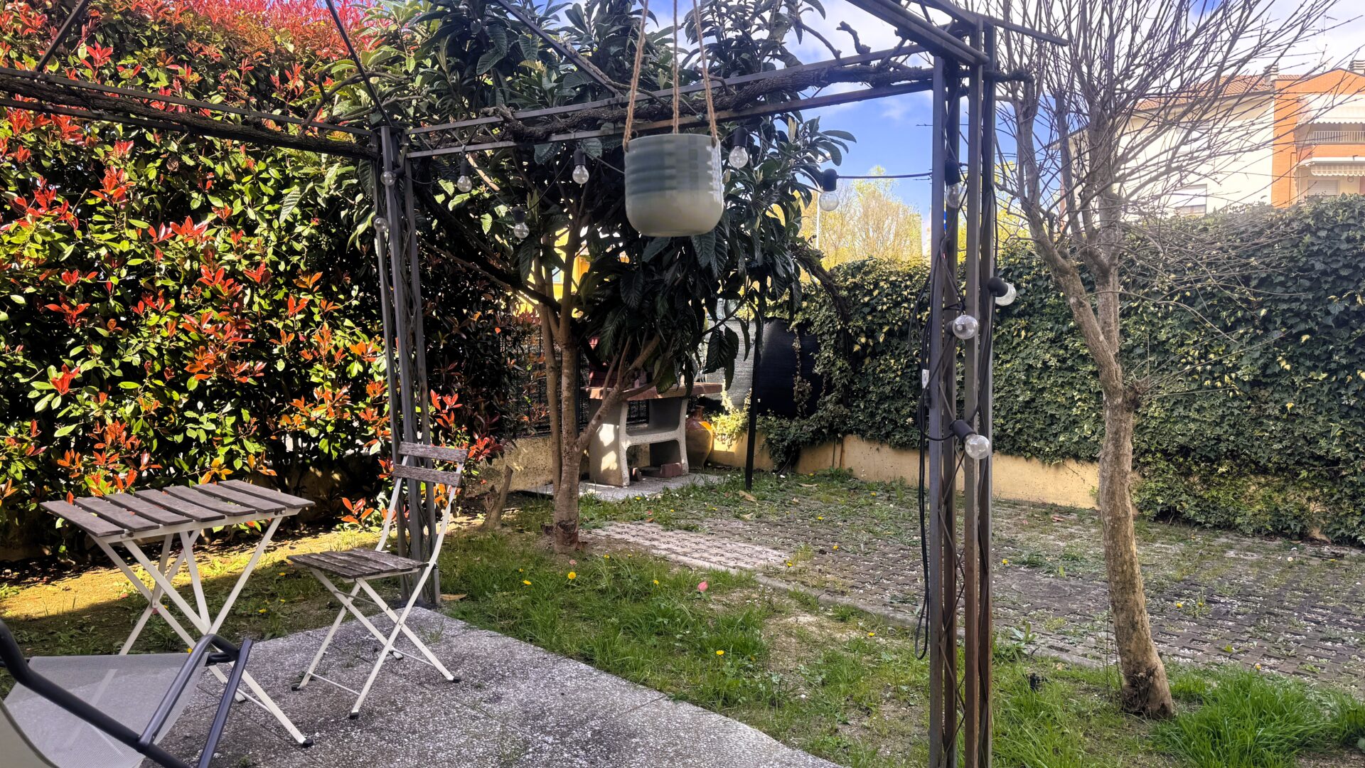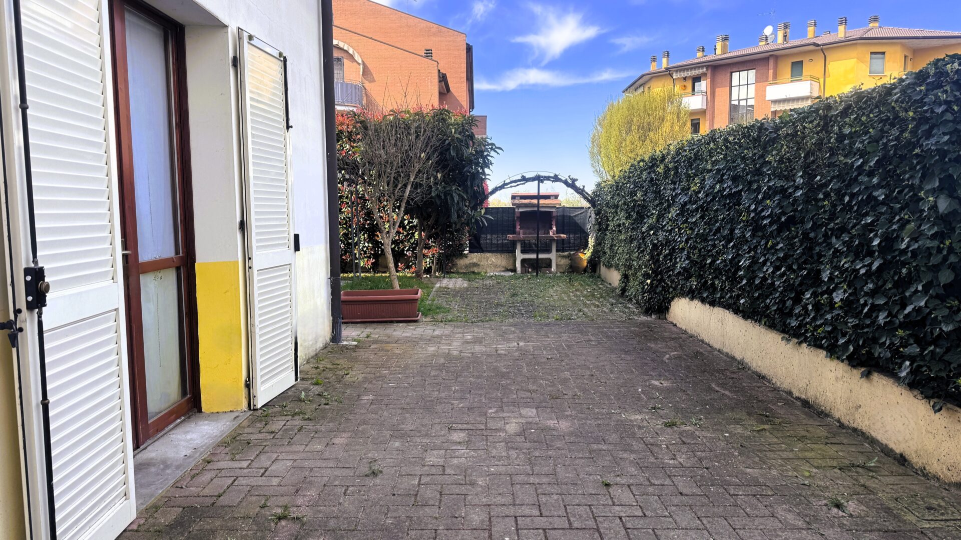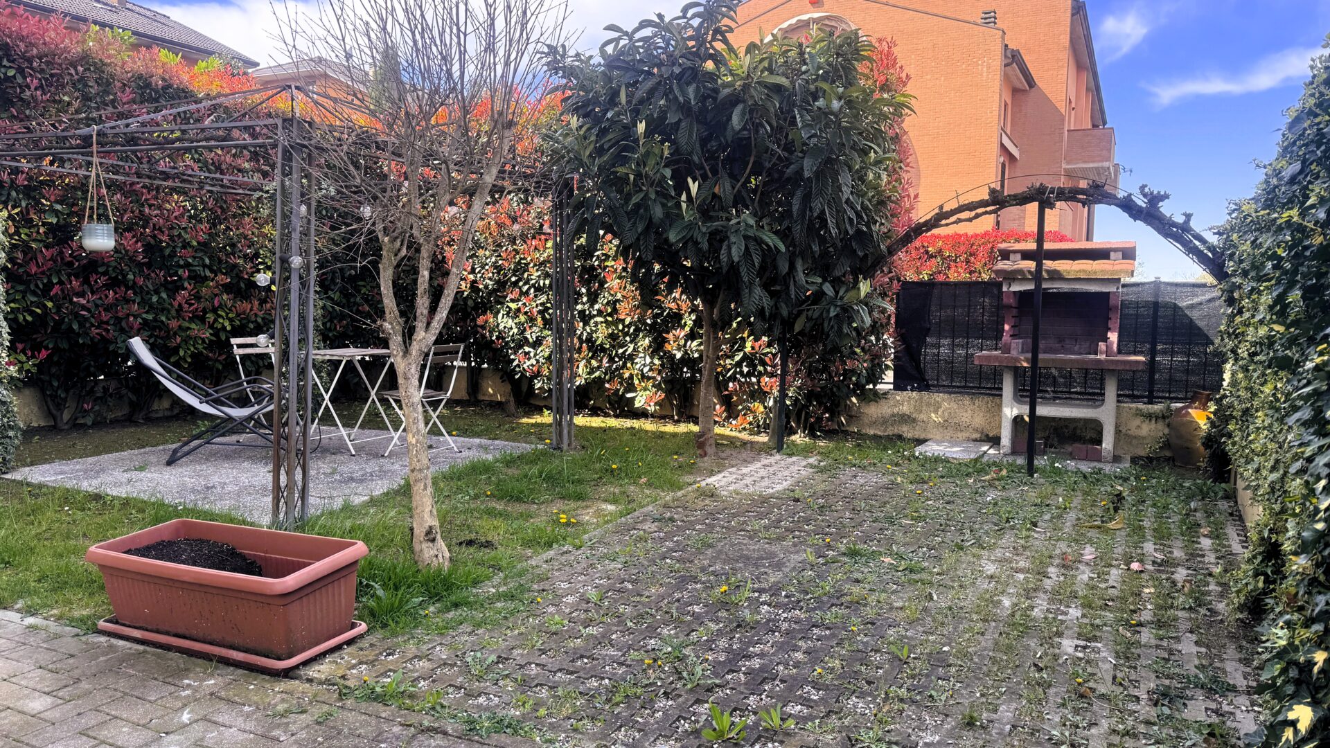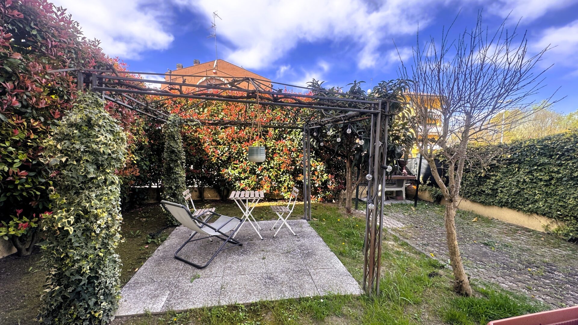 Il cortile e il giardino privato offrono uno spazio da vivere in ogni stagione: un gazebo per le cene estive, un barbecue per le giornate in compagnia, una casetta per gli attrezzi e un posto auto all’interno della proprietà. Di fronte, inoltre, è disponibile un comodo parcheggio pubblico e, per chi lo desidera, c’è la possibilità di acquistare anche un garage.