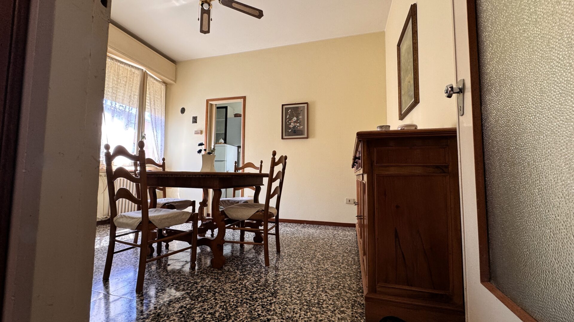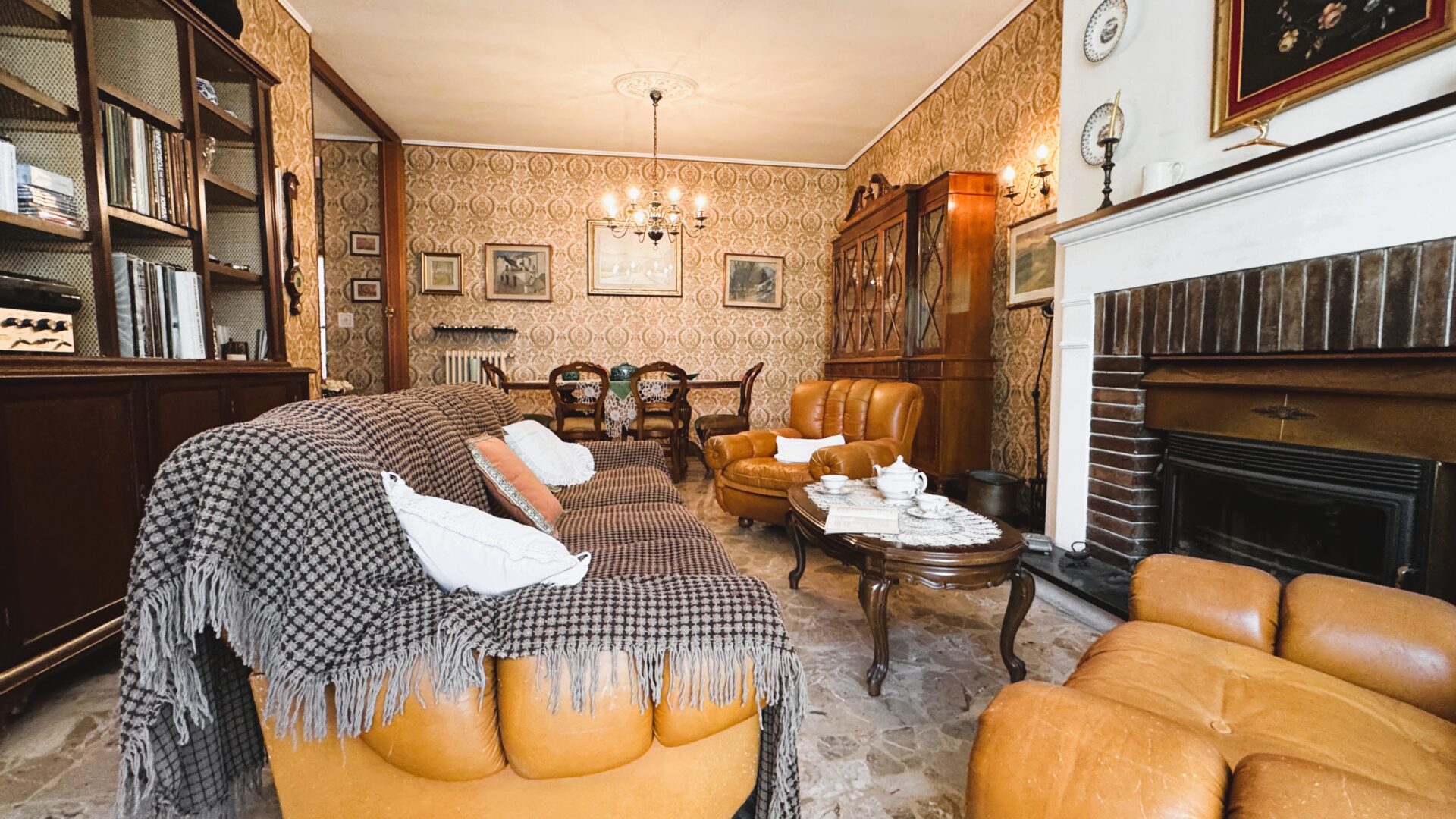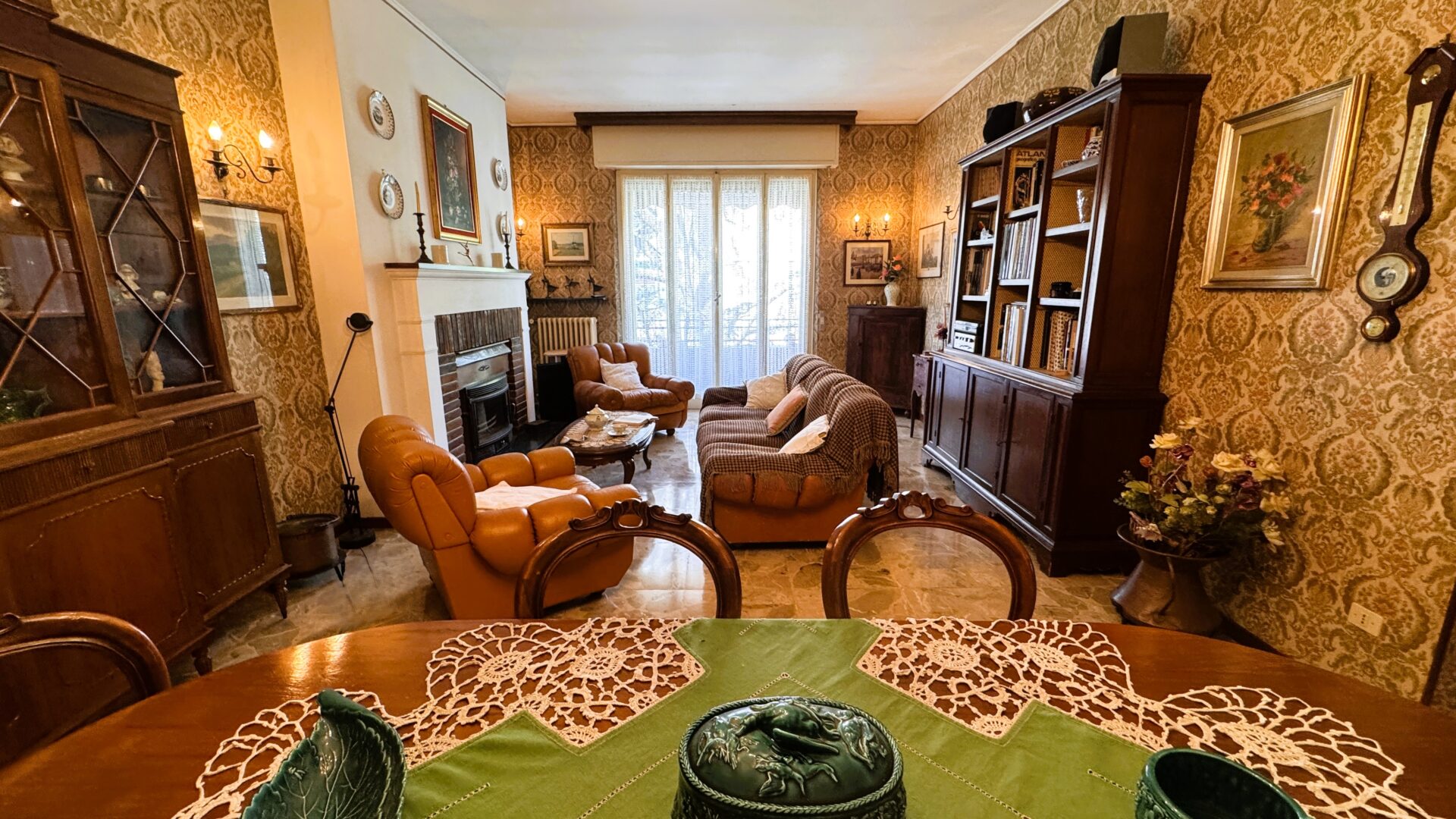 Il salone è uno degli ambienti più belli: spazioso, luminoso, con camino e accesso al balcone. È facile immaginare serate d’inverno qui, con la luce calda del fuoco. Accanto, la sala da pranzo con cucinotto: funzionale oggi, ma con un grande potenziale per chi desidera reinterpretare gli spazi in chiave più contemporanea.