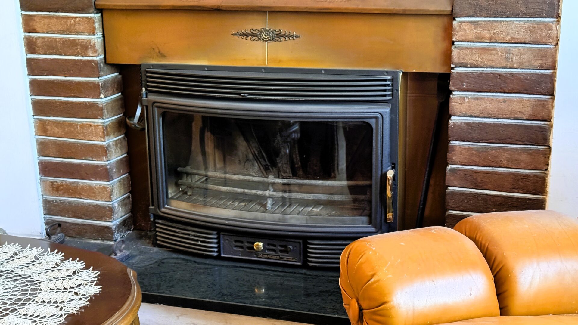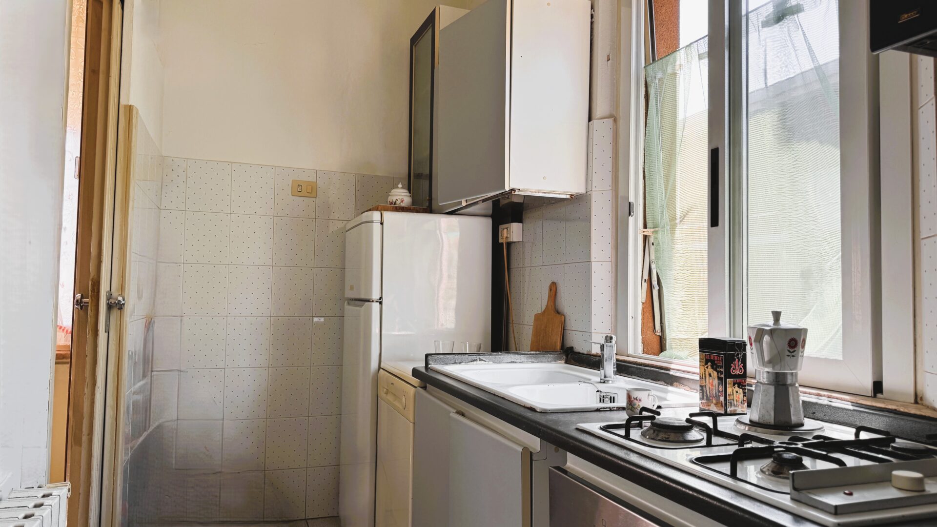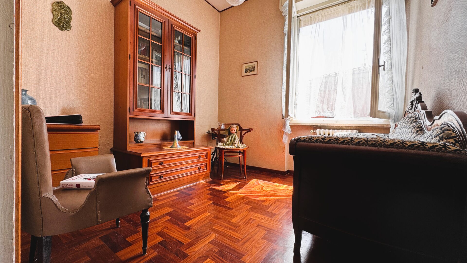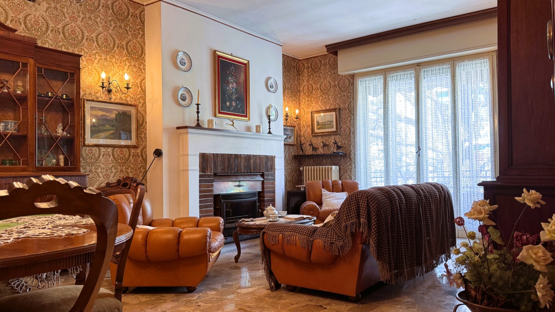 Il salone è uno degli ambienti più belli: spazioso, luminoso, con camino e accesso al balcone. È facile immaginare serate d’inverno qui, con la luce calda del fuoco. Accanto, la sala da pranzo con cucinotto: funzionale oggi, ma con un grande potenziale per chi desidera reinterpretare gli spazi in chiave più contemporanea.
