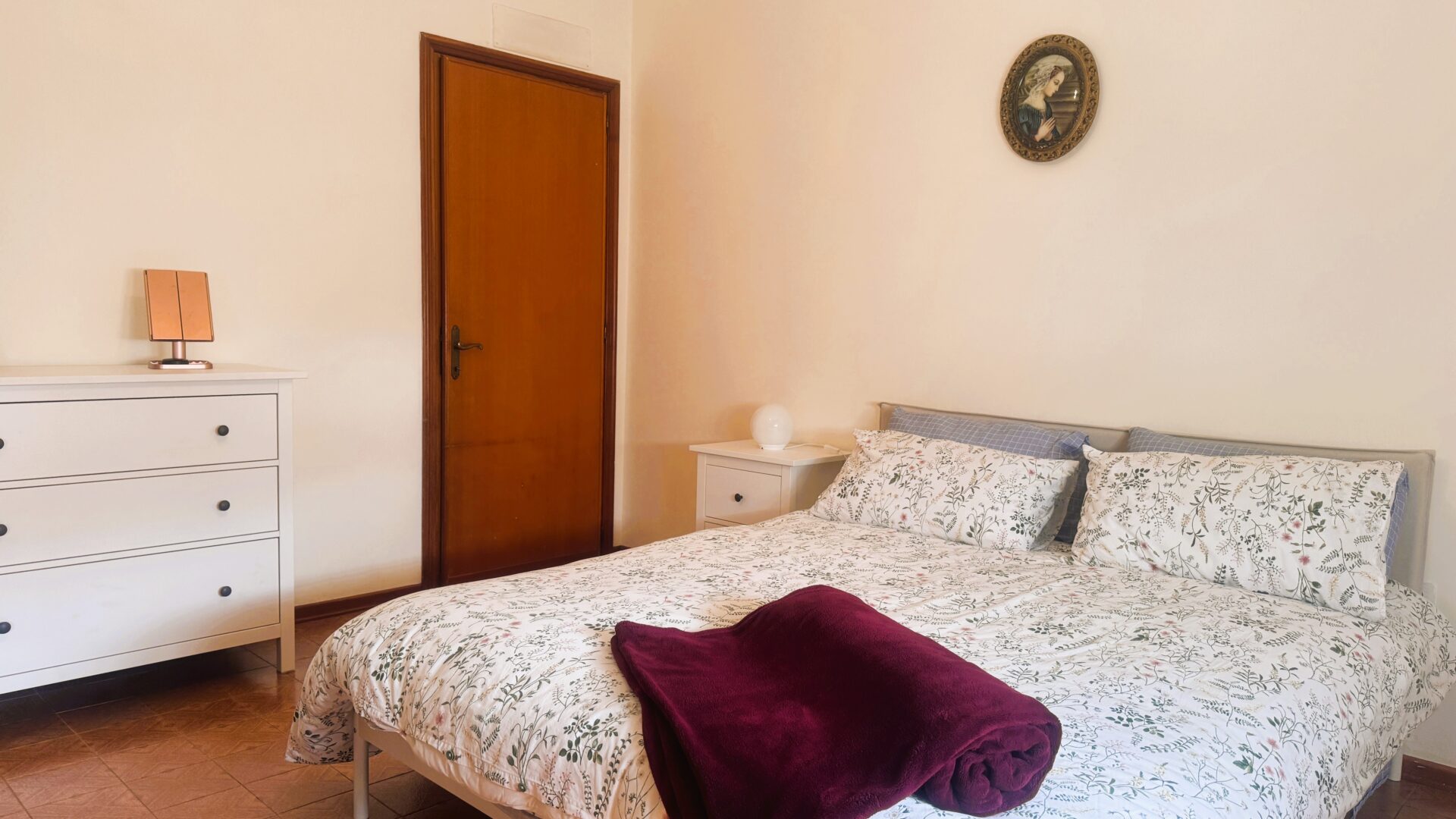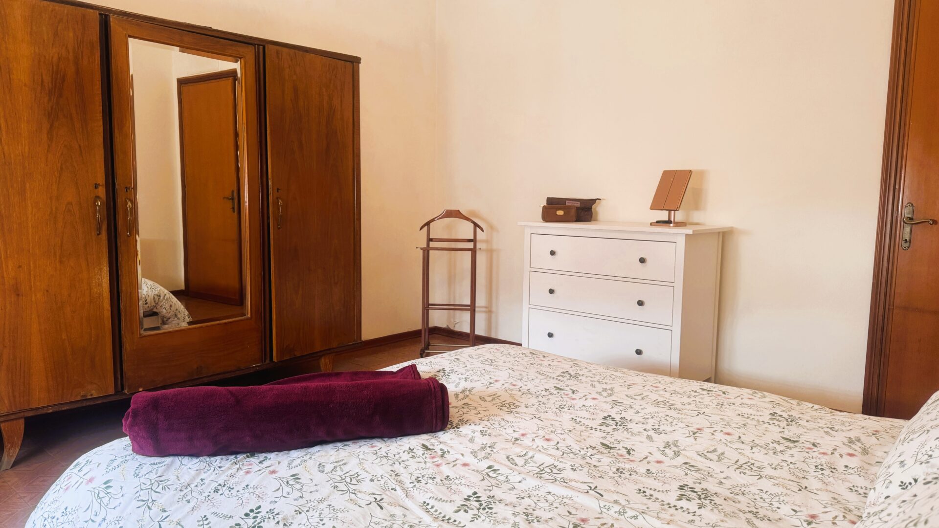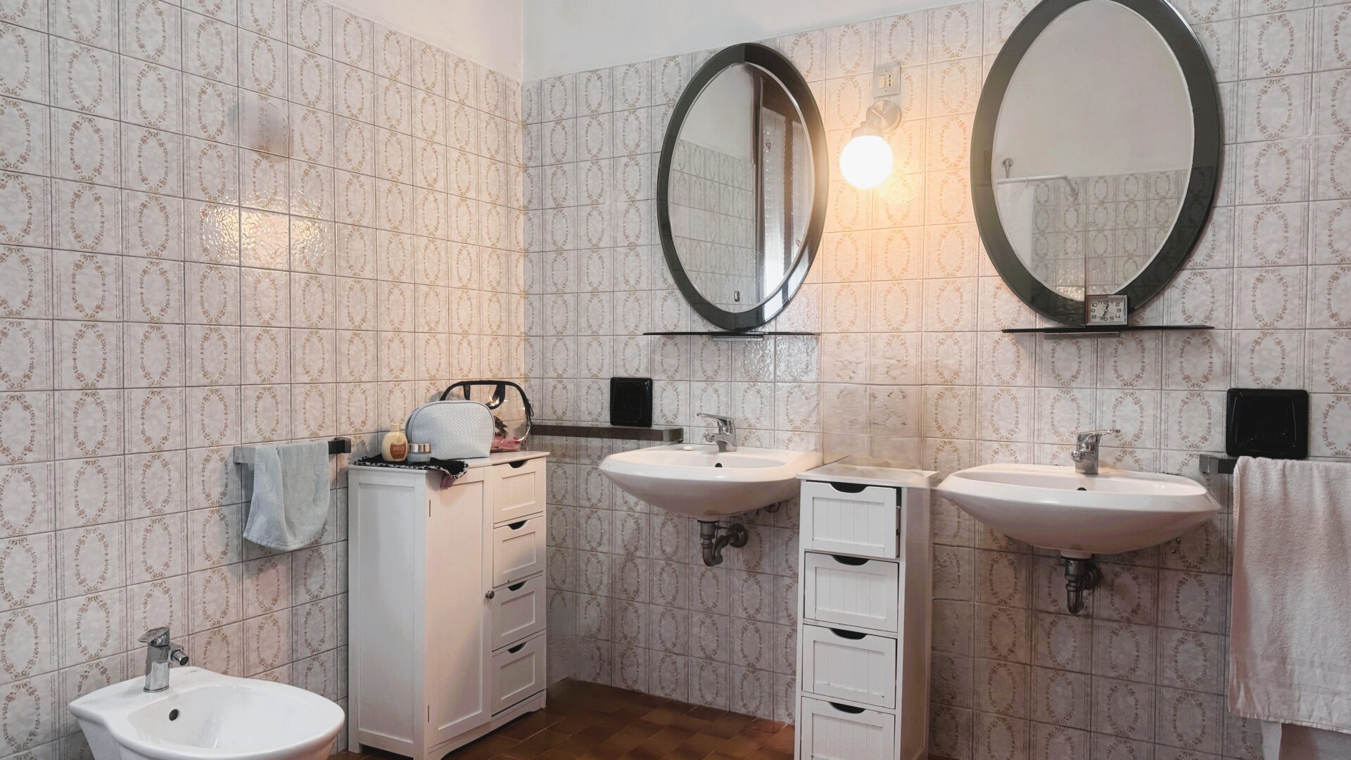 La zona notte offre due camere matrimoniali spaziose e una camera singola. Il bagno è ampio, completo di vasca, doccia e doppio lavandino: uno spazio pensato per la vita di tutti i giorni.