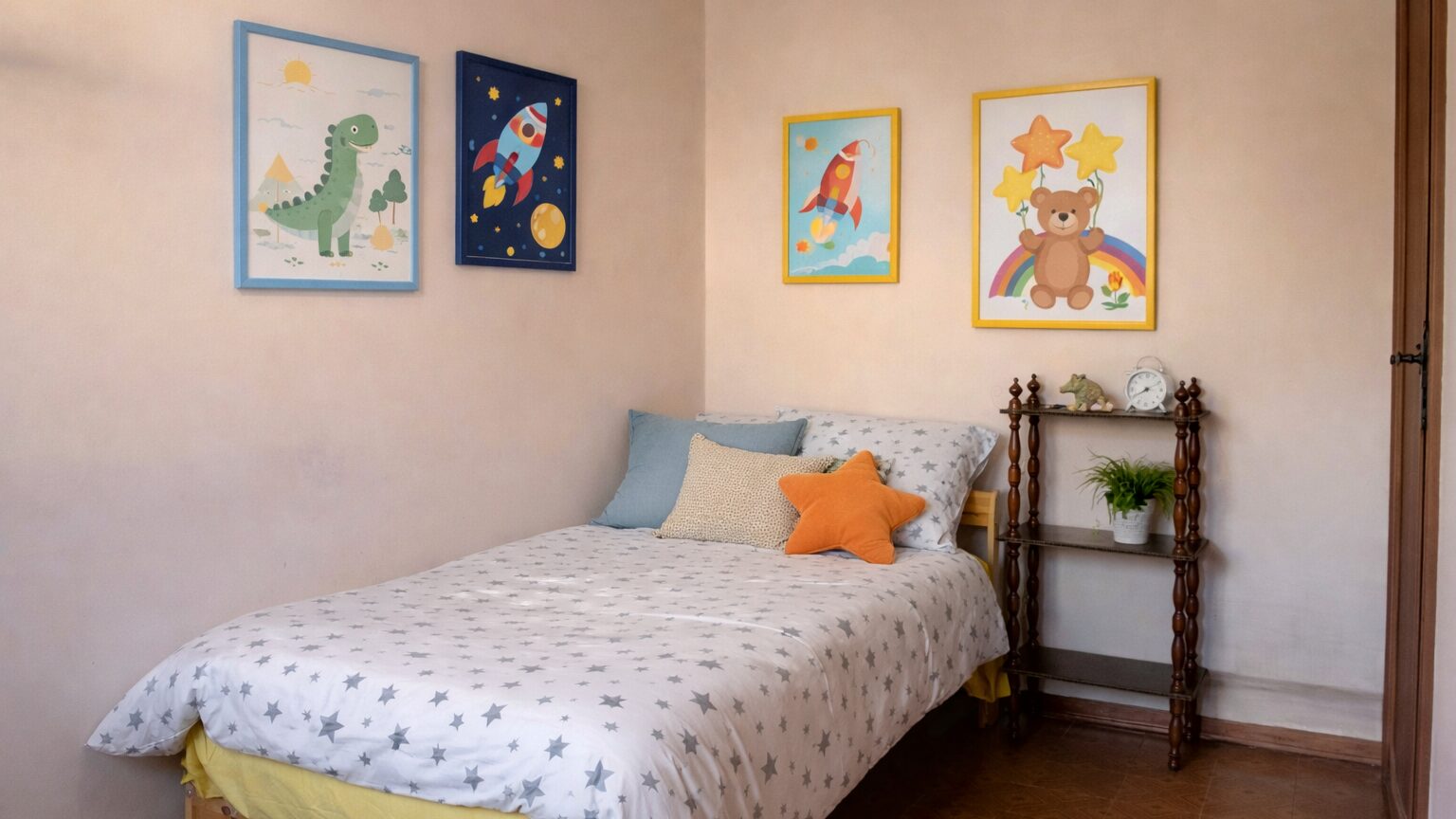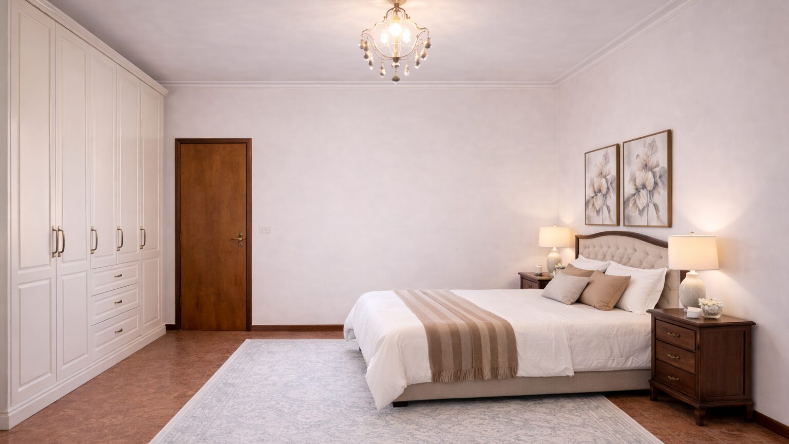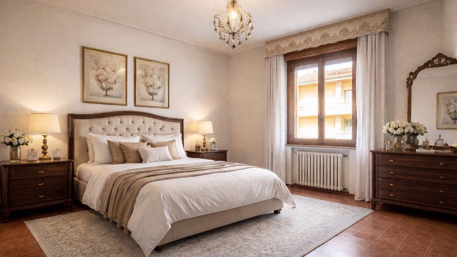 La zona notte offre due camere matrimoniali spaziose e una camera singola. Il bagno è ampio, completo di vasca, doccia e doppio lavandino: uno spazio pensato per la vita di tutti i giorni.