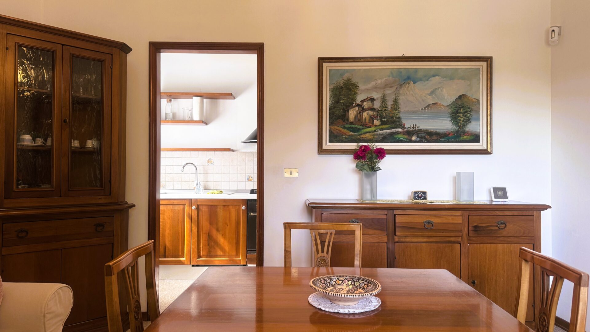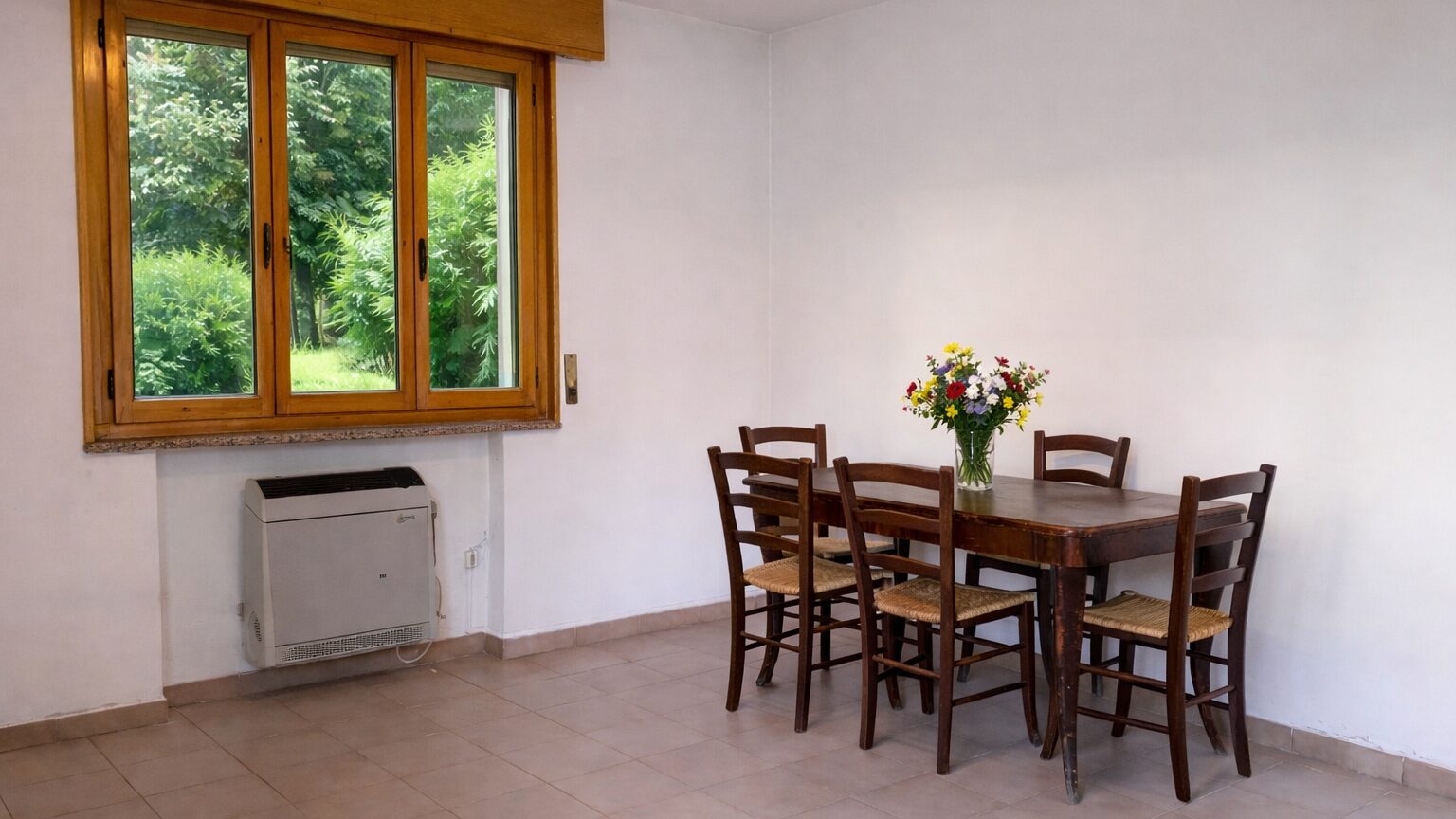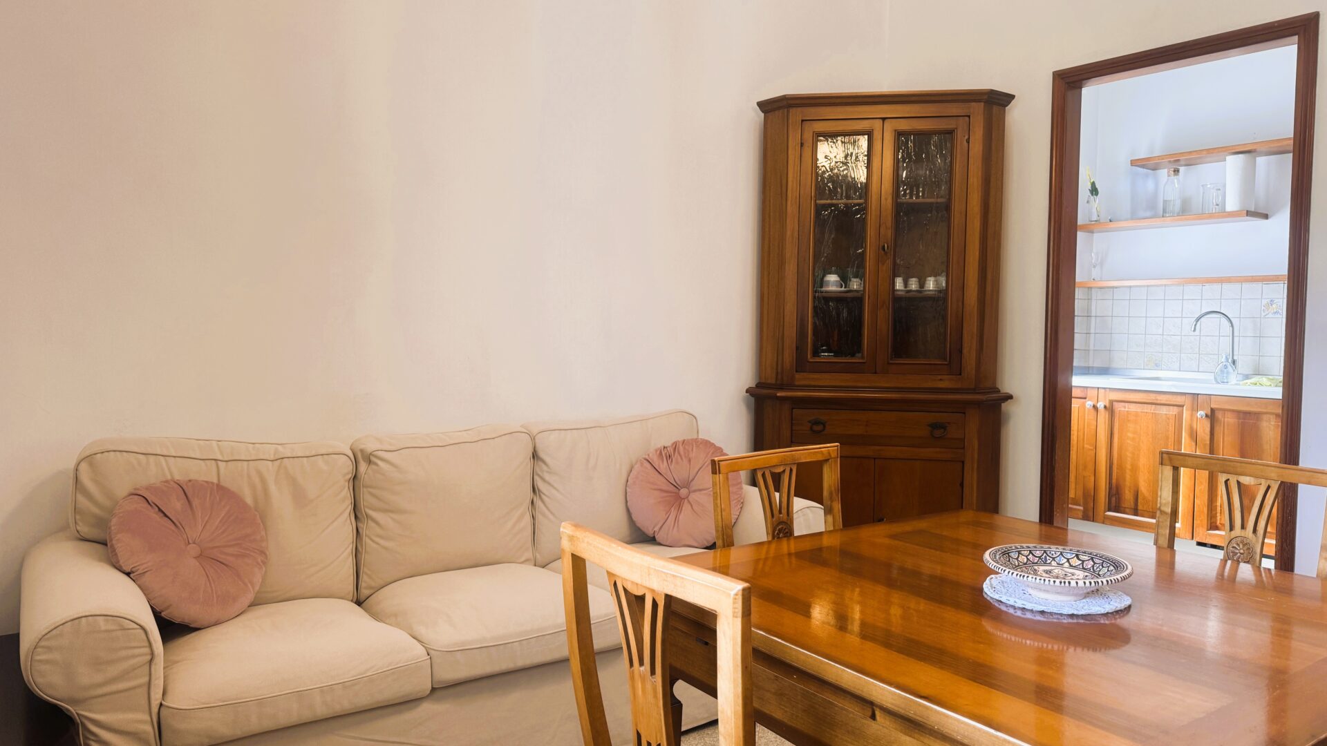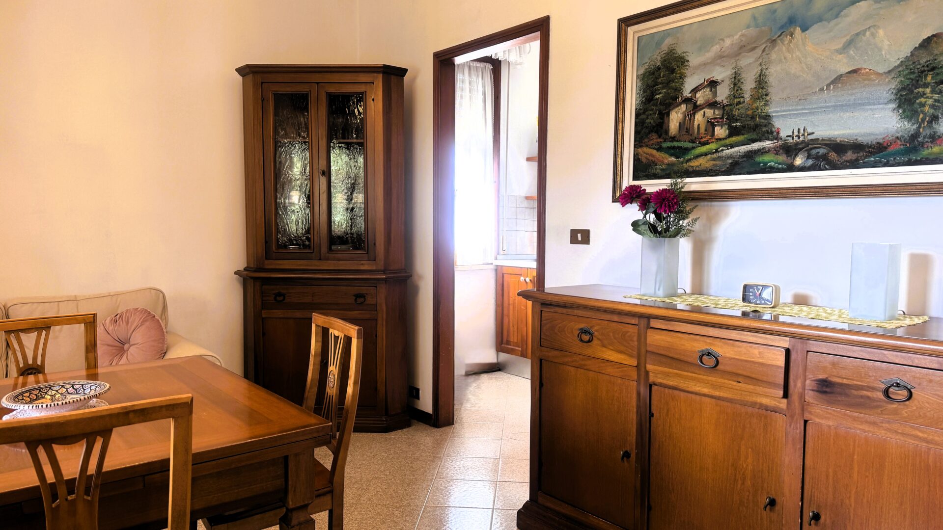 Il piano principale si trova al primo livello, con accesso da scala esterna. Qui si viene accolti da un ingresso che conduce alla zona giorno: da una parte la sala, ampia e particolarmente luminosa grazie alla porta finestra che si apre sul balcone e alla finestra a tre ante, dall’altra parte la sala da pranzo collegata a un cucinotto funzionale, perfetto per mantenere ordine e praticità nella quotidianità.
